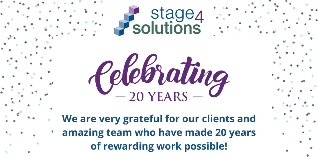Stage 4 Solutions’ 20th anniversary is a perfect moment to pause and reflect. Our beginnings were unplanned – 3 days after 9/11/2001, I resigned from my Director of Marketing role at a B2B software company and took the leap into independent consulting. I wanted to take a “break” from my career and wanted more flexibility for my then 2 and 4 year old children. I thought I would take 6 months for this break, explore new opportunities through consulting projects; then, I would get back to my career. I never expected my consulting “break” to grow into a national and international interim staffing company!